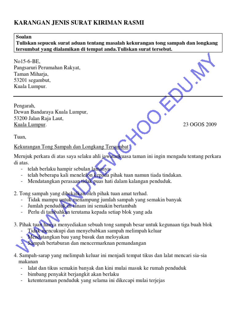 Surat Kiriman Rasmi. Contoh Surat Kiriman Rasmi Aduan Sampah Sarap Pengarah dewan bandaraya kuala lumpur 53200 jalan raja laut kuala lumpur.